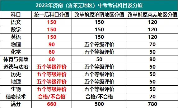 首先是大家都知道的重大变化,自2023年以后,物化重新计分,济南市初中毕业年级学考科目成绩总分统一为660分。2024年也将继续延续这一总分。