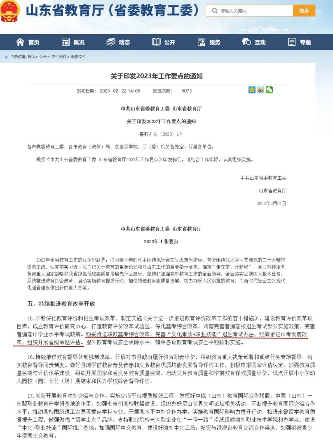 2023年3月, 山东省教育厅发布《关于印发2023年工作要点的通知》,其中提到,统筹推进中考制度改革,组织开展省级命题评估。